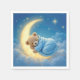 En söt nalle är färdigt inslagen i en blå filt och vilar fredligt på ett glansande halvmåne måne i en drömmarkväll himmel. Kan användas för en dusch i pojke.
