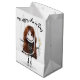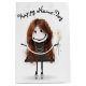 Cute stick-flicka med hår, senor, daisy bouquet, pärlhalsband och polkattklänning på vit bakgrund för Namn Day. Text kan ändras.