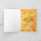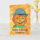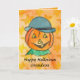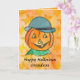 Ett beställnings- känt Halloween hälsningkort som presenterar en lycklig jack o lanternpumpa i ett plommonstop med en bakgrund av att flyta guld- gula stjärnor på en orange vattenfärg, tvättar bakgrund. Du kan ändra texten till passformen dina behov.