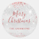 En faux silver metallisk tittar bakgrund, dekorerad med rött damm och faux silver glitter. Anpassa och lägg till din familj namn. Texten: God jul är skriven med ett modernt handskrivet skript i stil, brev. Röd text.