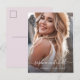 Detta enkla och snyggt vykort studenten-meddelande innehåller ett foto av student på framsidan, tillsammans med hennes namn i trendigets handskrivna manustypografi och en plats för hennes skola namn och år. Baksidan av vykortet är en modern, subtil rosa färg.