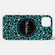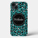 Lägg till Snyggten Blå leopard Spots iPhone 13 Fodral - Coola söt chic trendig teal blue, black and white leopard print spots mönster med svart namnskylt för anpassningsbarnas monogram brev och namn. Underbar gåva till flickor som kärlekar mönster och monogrammerade gåvor.