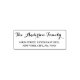 Skapa din egen anpassningsbar, personlig, enkel, elegant, snyggt, returadress i familjen namn, på det senaste självsvärtande gummiet frimärke. Ange ditt namn/din familj namn/företaget namn och adress. Perfekt för både hem- och affärsförsändelser, personliga försändelser och officiell. Elegant returadress frimärke för använda på födelsedagen, bröllop, giftermål-årsdagen, studenten, möhippa, babydusch, helgdagar eller någon annan speciell utsändning av familjens utskick. Underbar för inbjudan, kort, notekare, skrotböcker, presentkort, märkre som är pappra och mycket annat. Det kommer med ett val på 9 bläck färg.