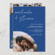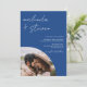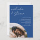 En modern inbjudan, chic och elegant bröllop med båge, skript namn med en handskriven kalligrafi i blå färg på året och vit med ett bågfoto och ytterligare tre foto i bakgrunden. Modern allt i en bröllopsinbjudan med osa, detaljer, logi och qr-kod. Hela texten, namn och färg i bakgrunden är anpassade. En enkel och minimalistisk inbjudan.