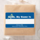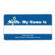 Märkre med eget namn med gultens blomma på blå bakgrund. Vit remsa till skriva namn. Ändra grund-texten så att namn i gruppen och händelsen visas.