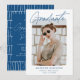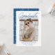 inbjudningskort för studentfest av trendig som innehåller student-fotot på framsidan med en vit, grov kant gräns. "Student" visas i ett blått namnteckning skript med student namn, skola namn och studenten som visas nedan. Den moderna studentfesten inbjudan återgår till visning av din studentfest med en unik blå och vit streckad mönster-bakgrund. Studentfesten inbjudan är perfekt för både högskoleexamen och party.