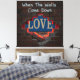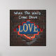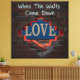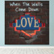 Den här designen fångar en kraftfull metafor för att visa en gömt sanning. Den har en vättad tegelvägg med en ojämn öppning, genom vilken ord "KÄRLEK" är delvis synlig och glödande med ett varmt, rött ljus. Uttrycket "När Komen nedför väggarna" står i ett lätt graffiti stil på tegelstenen och symboliserar det ögonblick då vi väljer att avslöja vad som har gömts.