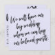 Den här svitens distinktion beror på det fet, avslappnad handskrivet skriptteckensnitt som används för accentfraser. Om du är i stånd att informera dina gäster i bröllop om att du måste ändra ditt stora datum, så finns det ett djärvt alternativ. I det här biet används det handskrivna skriptteckensnittet för att skapa enkla typografiska bilder. På framsidan står "Vi kommer att ha vårt stora bröllop när vi kan krama våra älskade gäster" och på baksidan, "Ny plan". Använda mallen fält om du vill lägga till dina personuppgifter och göra den här moderna designen till din egen. Bakgrunden kan ändras till valfri färg. Var god kontakta alla speciella förfrågningar eller anpassa hjälpen. 105