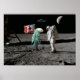 En APOLLO-astronaut och en fiskliknande utomjording står ansikte mot ansikte på månens yta med den amerikanska flaggan i bakgrunden. En UFO svävar ovanför, och halvmånen är synlig i fjärran.