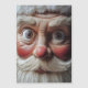 En mycket detaljerad närbild av en jultomtefigur med vida, uttrycksfulla ögon, röda kinder och en lysande röd näsa. De texturerade detaljerna i skägget och huden skapar en livfull och fantasifull representation som fångar ett ögonblick av förundran eller överraskning.
