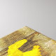 En gul narciss i en kanna med vatten på trä med målerisk textur