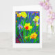 Kort med ljusa, glada narcisser på framsidan. En digital målning från ett fotografi. Tom insida för ditt eget meddelande.