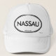 Välkomnande till Nassau! Är du från Nassau, Bahamas? Har du en vän eller en familjemedlem som älskar Nassau, Bahamas? Om så, är denna "lägeläge" hatt vad du söker efter! Designen presenterar "Nassau" i stor svart bokstäver och "Bahamas" i mycket liten svart bokstäver som omges av två ovaler, en som är tunn, och en som är tjock.