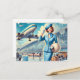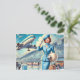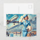 Här är vykortet för vattenfärg-stil som har en glamorös 1960-talsassistent med en snyggt blå uniform, passande hatt och vita handskar, som nu är målade med fluid brushstrokes. ✈️ 🌍 Bakgrunden omfattar en snyggt flygplatsterminal med stora glasrutor, resgodsvagn med vintage, en klassisk flygplatslimousin och passagerare som går ombord på flygplan. Texten "Nästa stopp: Äventyr!" är i elegant, flyter skript med vattenfärgen struktur och skapar ett drömt, nostalgiskt resvib.