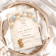Mjukt gingham, spridda gyllene stjärnor och en vågig antikkram gör den söta scenen komplett för denna ”We Can Bearly Wait”-design. En gullig teddybjörn som håller i en delikat ballong sitter bland drömlika moln och skapar en varm och tidlös barnkammarinspirerad estetik. Den milda blå och beigefärgade paletten gör den perfekt för en babypojks-firande samtidigt som den fortfarande känns mjuk och klassisk. Mysig, charmig och elegant på ett enkelt sätt – ett vackert sätt att samla nära och kära innan barnet kommer.