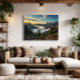 Majestätiska berg reser sig under en gyllene och blå himmel, insvepta i en lugn dimma. Ett ömtåligt geometriskt nät överlagrar scenen och förvandlar den till en surrealistisk dröm där rå natur möter mjuk konst. Levande färger, frodig vegetation och kontrasten mellan realism och abstraktion skapar ett verk som inger fred och förundran – perfekt för dem som vill koppla sig till den naturliga världens magi.