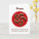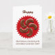 Firar National Chocolate täckte Cashew Day (21 april) med detta pappra hälsningskort. Fem chokladtäckta kaskor placeras på en röd mörk med ett sercerat kant. Ljusvit bakgrund. Art, bild och versell copyright © Shoaff Ballanger Studios.