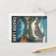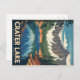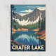 En reseaffisch mellan vintage och stil för nationalparken Crater Sjö visar de djupa blå sjö som reflekterar berg med tak över snö och skogarna i gräs under ett tydligt blå himmel. "CRATER SJÖ NATIONAL PARK" visas djärvt i grund.