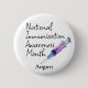 Med denna knapp för nationell medvetenhet om immunisering Månadens medvetandegörande, designad för att öka medvetenheten och starta samtal. Texten "National Immunization Awareness Month" (Nationella vaccinationsmånaden)" visas i ett vänligt handskrivet teckensnitt överst, med en personlig, lättillgänglig beröring. För högerna symboliserar en mjuk vattenfärgad illustration av en spruta vaccinering med mjuk färg och klarhet. Ord "augusti" står i fet brev vid grund i ett fet block, och jordar budskapet med en stark synlig ledtråd. Denna knapp är både meningsfull och öga-fångstande och passar perfekt för professioneller inom hälso- och sjukvården, förespråkare och medvetandehöjande evenemang.