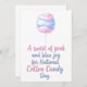 Fira National Cotton Candy Day med detta fantasifulla, pastellfärgade vattenfärg tackkort! Med mjuka rosa och blå bomullscocktailillustrationer i en lekfull, barnvänlig stil är det perfekt för födelsedagar, karnevalsteman partyn eller bara ett glatt sätt att säga tack. Citatet "Fluffig, färgrik och söt—Glad National Cotton Candy Day!" är handskrivet med en mjuk, luftig borstskrifttyp med mjuka rosa-till-blå gradienter och subtil vattenfärgstruktur. Ren vit bakgrund och drömlik utrymme skapar en lätt, söt och fantasifull estetik som alla kommer att älska.