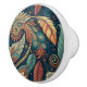 I den här abstrakten är mönster-kabinettknoppen en vriden av fjädrar, blommor och paisleyliknande former i dammig, terra cotta, rost, blått grönt och grädde. Stil-utskriften i vintage skulle passa in i en mängd dekanta färg och stilar, med ett mönster med fet snurrande i muterade toner.