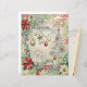 The design features a vibrant patchwork border of distressed red and sage green patterns, including damasks and plaids, framing a soft, snowy center. The center is richly decorated with classic holiday elements: bold red and cream poinsettias, snow-dusted foliage, and festive ornaments.