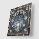 This square wall clock features a highly detailed, dimensional illustration of the Nativity scene centered within an elaborate border. The central motif, set against a dark blue background, shows Mary, Joseph, and the Baby Jesus in the manger, surrounded by other figures. Above them, the text "PEACE ON EARTH" is prominently displayed, flanked by two angels and two white doves. The entire circular scene is framed by a rich blue and gray floral wreath of white lilies and blue berries. The illustration is set within a wide, dark outer wood-look frame, which is simulated using high-detail artwork and is not real wood.