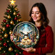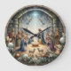 This solemn clock depicts a beautiful Nativity scene, with Mary and Joseph kneeling by the Baby Jesus in the manger, surrounded by shepherds and lambs. The stable is framed by a rustic stone archway, with a bright star and angels shining above. The border is decorated with festive garlands, ornaments, and pine sprigs. The design may look real due to the high detail and three-dimensional texture in the artwork.