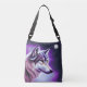 Detta är en vacker väska för en varg älskare med en illustration av den mystiska vargen ansikte i vitt och med lila- och blåfärgade nyanser.