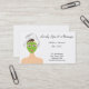 Visitkortar som är passande för någon brunnsort- eller ansiktsbehandlingaffär. Detta kort presenterar en vitbakgrund med en teckning av en dam med en grön ansiktsbehandling maskerar på vänster sida. All text är anpassadet på bekläda, och baksida och du kan tillfoga mer, om behövda.