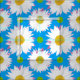 Ett mycket nätt blom- tyg med upprepande ett sömlöst mönster av daisy på en himmelblåttbakgrund som du kan ändra, om du önskar. Delen av den Posh och Painterly "daisyn kedjar" samlingen, detta mönster är från enmålad papper collage av Judy Adamson.