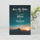 Modern bröllop spara datum-mallkort. Bakgrund är ett vackert foto av en mörk turkos blå nattblått himlar med en galaxi av stjärnor över och en soluppgång över berg under. Texten är en kombination av ett vackert handskrivet skriptteckensnitt och en elegant sans serif. All information kan enkelt anpassas.