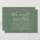 Meddela gärna att du är i stil när du är på väg med vårt moderna tema för grönt av skogsskö (The Natt before), inbjudan till bröllop-repetition från firande. Det är idealiskt för par som har bestämt sig för att fira natten före deras stora dag. Med sin sofistikerade men lekfulla utformning kommer inbjudan säkert att ange tonen för en händelse som inte kan glömmas bort. Inbjudningskortet har en modern romantisk skriptutformning som ger dig en aning elegans utan tidpunkter i firande. Designad av TeeshaDerrick