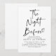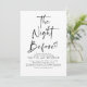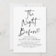 Den här snyggten, den moderna inbjudan till repetitionsmiddag, med titeln "Natten före", kombinerar lätt minimalism med en romantisk beröring. Den är utformad som en elegant och slående väg till inbjudan vänner och familj till på en speciell kväll kväll i bröllop. Med öga-infångande, handskriven typografi och en delikat hjärtillustration ger den en lekfull charm och ett avslappnat vib som uttrycker nuvarande trender för stationära bröllop. Dess mångsidiga utformning anpassar sig till en rad olika bröllop-stilar, skapar det som ett perfekt val för allt från klassiskt svart-vitt bröllop till bohemiskt, rustiskt eller contemporary. Den rena vita bakgrunden och fetstilta svarta texten skapar en sofistikerad kontrast. Justera texten och bakgrunden till färger för att anpassa sig till ditt bröllop färg-system och se till att det harmoniseras perfekt med ditt tema. Oavsett om du planerar en mysigt sammankomst eller en lavish-händelse är den här inbjudan designad för att ange en tidpunkt för ett oförglömligt firande före bröllop. Den balanserar modern design med romantiska detaljer, perfekt fångar förväntningarna och glädjen över natten före dina löften.