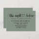 Ange tonen för firande med denna moderna och sofistikerade inbjudan till repetitionsmiddag. Med en slimmad svartfärgad kalligrafi som anger "natten före" bredvid en charmig hjärtedetalj på en mjuk grönt, strejkor denna design perfekten mellan enkelhet och romantik. Anpassa den enkelt med dina egna detaljer så att den blir riktigt din egen.