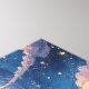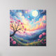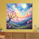 En magisk och vibrerande landskapsmålning med en blommande rosa träd, rullande grönt backe och en meriserande nattmålning himmel med en glödande måne, planeter och twinkling stjärnor, som framkallar och lugn.