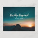Elegant och modernt bröllops-RSVP-kort. Bakgrunden är ett vackert fotografi av en mörk turkosblå nattlig himmel med en galax av stjärnor ovan och en soluppgång över berg nedan. Texten är helt anpassningsbar och visas i en stilren kombination av handskriven skrift och sans-serif-teckensnitt.