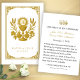 Ett djupt vördnadsfullt bröllopssouvenirskort med den Heliga Kommunionen med monogrammet ”IHS” förhöjd över en gyllene kalk, flankerad av nattvardsvete och druvor samt Jesu, Marias (krönt med rosor) och Josefs förenade hjärtan. Omgiven av en utsirad barockram utstrålar denna design det vigdas helighet, förankrad i den Allraheligaste Eukaristin och den Heliga Familjen. Perfekt för katolska bröllop, årsdagar eller andliga bröllopspresenter. Personliggör med namn och bröllopsdatum.