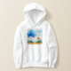 The painting is done in watercolor. Bold use is made of bright blue for the tree and sky, and bright orange and red splashes for the flowers and ground.