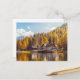 Livets skönhet i ett skott. Ett vackert hus vid sjö kuster och en vacker bakgrund av färgstarkt träd med färg under hösten.
