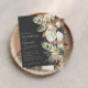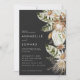 Naturligt bohemiskt botaniskt modernt elegant-mörk för lövbordsinbjudningskort för svart bröllopsgäst. Vackra handtryckta vattenfärger i botaniska blommigtar och manustext. Modern trendutformning.