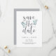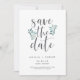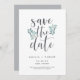 Vackra grönt- och grått bröllop spara datum-kort har grått-bokstäver som accentueras av isigens blåfärgade blad, löv och vita bär. Anpassa med namn, datum och plats för bröllop och all annan information, som till exempel webbplatsen för bröllop. Ett modernt val i ett naturligt färg-system för boho, skogsmark eller naturen gav bröllop under vilken säsong som helst.
