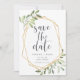 Vackra grönt- och guld bröllop spara datum-kort har grått-bokstäver som är inramade av ett faux guld-geometriskt gräns och ljust grönt vattenfärgsblad, löv och vita bär. Anpassa med namn, datum och plats för bröllop och lägg till ytterligare information, som bröllop webbplats, på motsatt sida. Ett modernt val i ett naturligt färg-system för boho, skogsmark eller naturen gav bröllop under vilken säsong som helst.