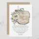 Den vackra neutralten faller vinter-blommigtens kallelse till bröllop är rustik boho-chic som inspirerats av ett träsegment och en naturlig jordens färgtonsblad. Elegant benvita ro, sage löv, eukalyptus och gräs cones dekorerar trädjournalen i kor med dess årliga ringar för att visa ett starkt och långvarigt förhållande. Baksidan av inbjudan visningar ett pappert brunt kraftprov som ska läggas till i den rustiska charmen.