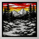 Vacker svart-vit landskapsbild med en flod som flyter genom träd och berg under en levande flerfärgad solnedgångshimmel, som visar naturens harmoni och frid.