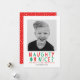 Visa upp dina favoritstygga eller trevliga barn med ett fotokort för roligt och snyggt helgdag. Det moderna jullokortet har ord "Naughty or Nice" i ett trendig med typsnittet stil, rött och grönt färg och platshållare för foton och texter. Baksidan har en ljusröd och vit punkt mönster.