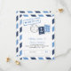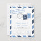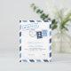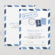 Flyginspirerat Spara datumet-kort i marinblått och pudersvart. Falskt frimärke och poststämpel för ett res- och nautiskt bröllop.