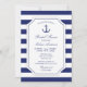 Det här kustinspirerade nautiska inbjudningskort för möhippan-kortet för elegant har ett blått ankare för snyggten med rep och en blå och vit strimlad bakgrund med personlig för duschen.