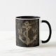 Det vackra nautiskt inspirerade kaffet mugg har ett beige ankare och ett monogrammat initialer på båda sidor om det för att du ska kunna anpassa dig. Bakgrunden är svart med en övertäckning av en världskarta. Designad av världsberömd konstnär ©Tim Coffey.
