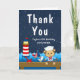 Det här söta och roligt tack du har på ett trädäck med fiskmås och en krabba. I bakgrunden finns ett rött och vitt fyr, en söt fågel på en segelbåt, havets vinkarare och en marinblå stjärnkväll himlar. Texten kombinerar djärvt och seriöst typsnitt för en snyggt och ett modernt utseende. Det här är perfekt för en nautisk födelsedagsfest.